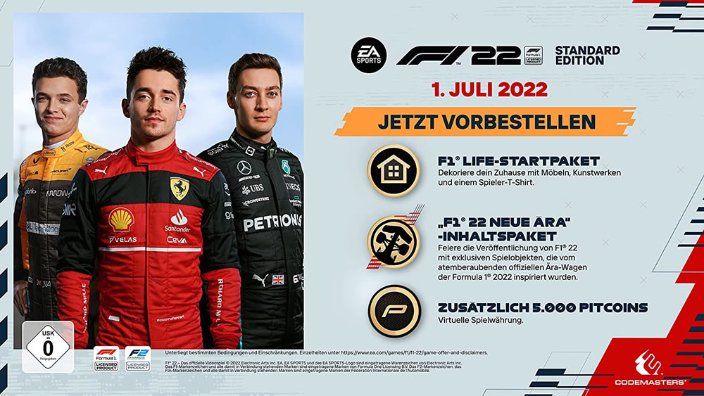 Steig in EA SPORTS F1 22, dem offiziellen Videospiel der 2022 FIA Formula One World Championship, in die neue Ära der Formula 1 ein. NUR FÜR BEGRENZTE ZEIT – Erhalte das Miami-Inhaltspaket, wenn du die F1 22 Champions Edition bis zum 16. Mai 2022 VORBESTELLST.